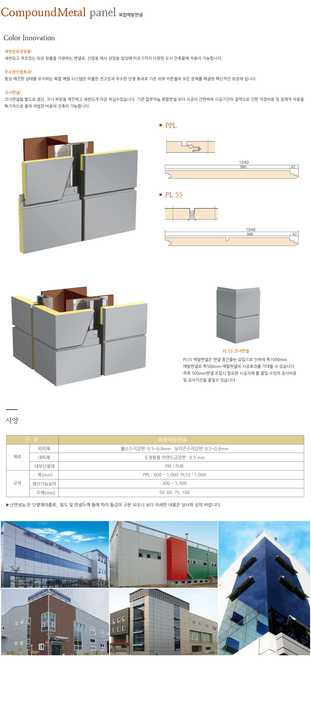 Compound Metal panel 복합메탈판넬 무실리콘 작업 자유로운 매지라인 코너 판넬 제작 저렴한 공사비용 우수한 평활도 독특한 물끊기 설계 Color Innovation ... 세련된 외관 창출! 세련되고 격조있는 외관 창출을 자랑하는 판넬로, 산업용에서 상업용 빌딩에 이르기까지 다양한 도시 건축물에 적용이 가능합니다. 우수한 단열효과! 항상 깨끗한 상태를 유지하는 복합메탈시스템은 탁월한 견고성과 우수한 단열효과로 기존 외부 커튼월의 모든 문제를 해결한 혁신적인 외장재입니다. 코너판넬! 코너 판넬을 별도로 생산, 코너 부분을 깨끗하고 세련되게 마감하실 수 있습니다. 기존 알루미늄 복합판넬보다 시공이 간편하여 시공 기간의 절약으로 인한 직접비용 및 잠재적 비용을 획기적으로 줄여 저렴한 비용의 건축이 가능합니다. ■ PPL PL 55 코너판넬 PL55 메탈판넬은 판넬 중간 줄눈 삽입으로 인하여 폭 1000mm 메탈판넬로 폭 500mm 메탈판넬의 시공효과를 기대 할 수 있습니다. 즉 폭 500mm판넬 조립시 필요한 시공자재를 줄일 수 있어 공사비용 및 공사기간을 줄일 수 있습니다. ■ PL 55 사양 구 분 복합메탈판넬 외피재 재료 내피재 내부단열재 폭(mm) 규격 생산가능길이길이(mm) 두께(mm) 불소 수지강판: 0.5~0.8mm 실리콘 수지강판: 0.5~0.8mm 도장용융 아연도금강판 : 0.5 mm PIR / PUR PPL : 600 ~ 1,000 PL55 : 1,000 300 ~ 5,500 50 60 75 100 ✽ 난연성능은 단열재의 종류, 밀도 및 판넬 두께등에 따라 등급이 구분되오니 보다 자세한 내용은 당사와 상의 바랍니다.